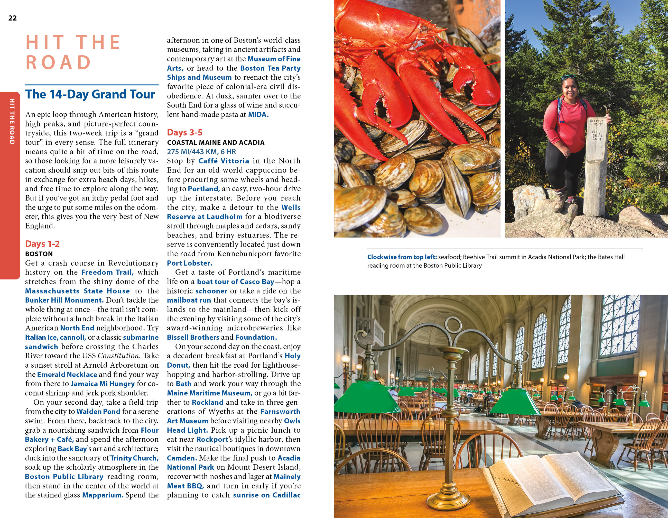 - Eat, Sleep, Stop and Explore: With lists of the best hikes, views, eateries, and more, you can trek among spruce trees in the White Mountains, cycle through Acadia National Park, or cruise down bucolic lanes of Woodstock. Take to the sea and spot humpback whales and puffin colonies, shop for wood-fired maple syrup, or snag a buttery lobster roll after a day at the beach. Dive into Boston’s revolutionary history, sample farm-fresh produce in the Berkshires, party in Providence, or sip your way through some of the area’s best microbreweries